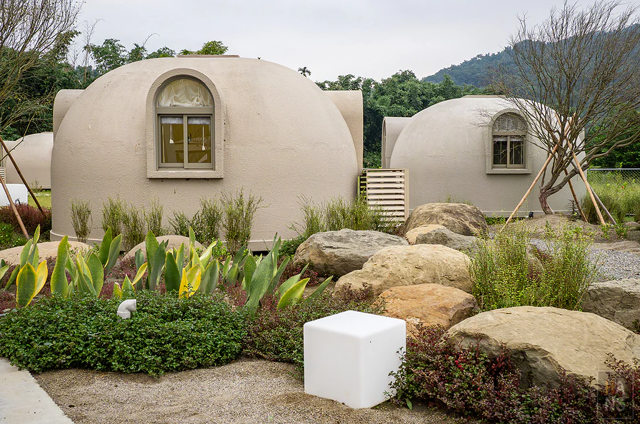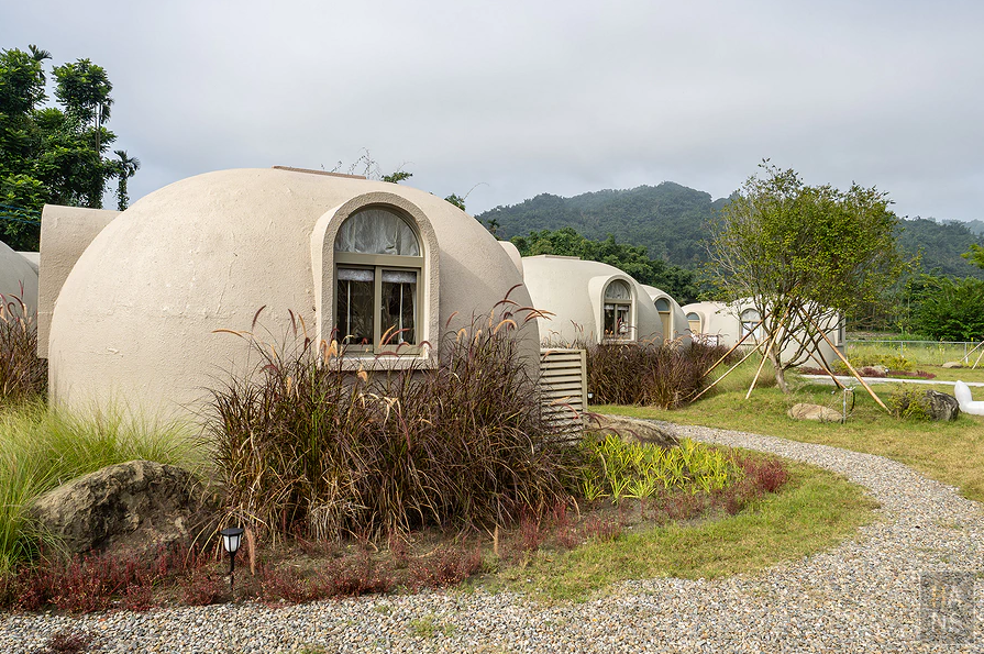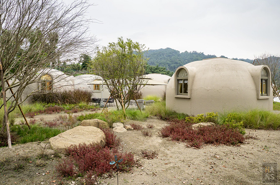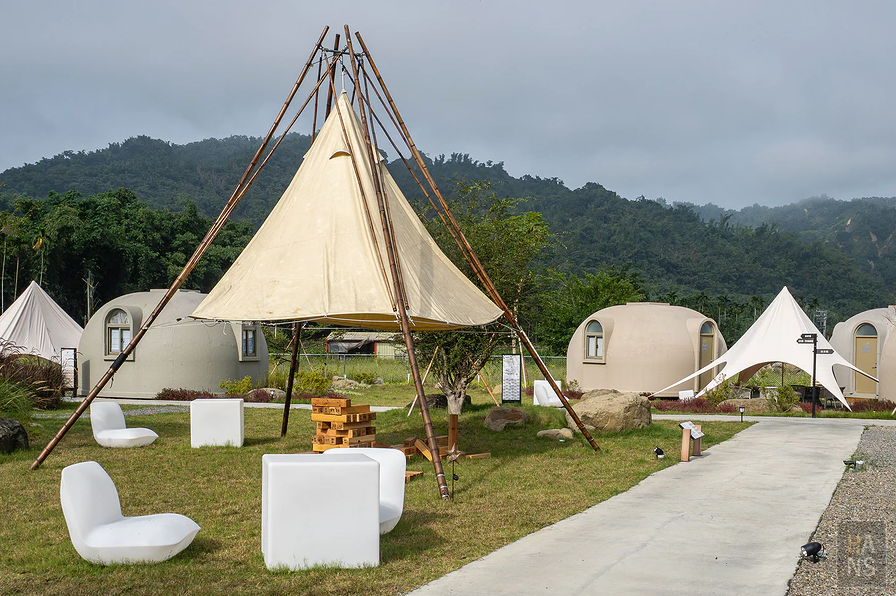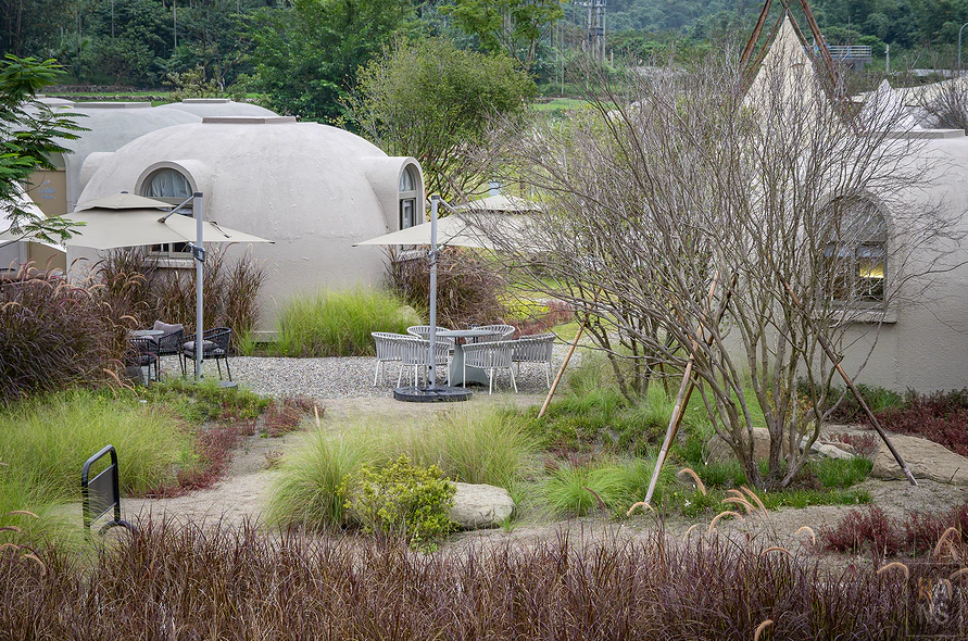 《波希謐境》園區內共20間波波屋,外型採用圓弧狀的建築設計,以簡約波希⽶亞⾵為主要⾵格,加入了木、竹、藤等自然木質,並與室內外的綠植做呼應,形成非常特別的園區景觀。