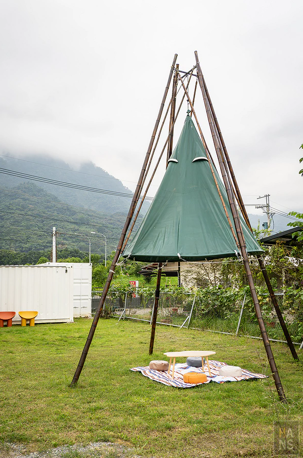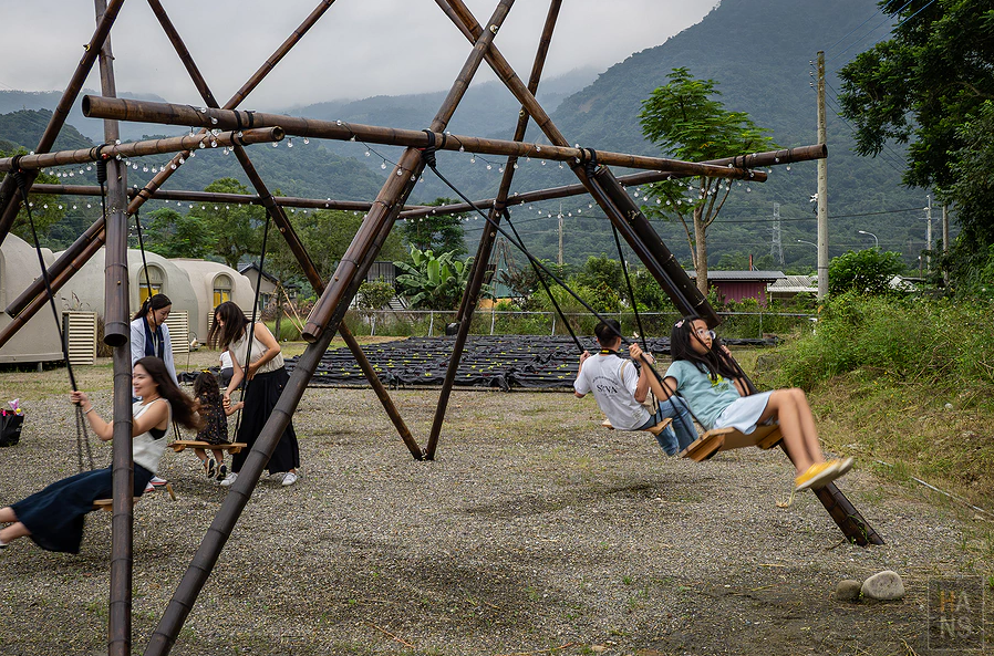《波希謐境》園區一隅,還有台灣設計師打造的「四角星鞦韆」,是使用台灣孟宗竹手工打造,可四個人同時使用,結合趣味與休憩,讓體驗更豐富。