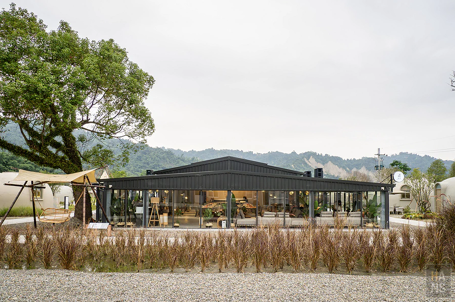 《波希謐境》佔地約5千坪面積(目前先開放一半腹地),站在園區一隅尚未開始營業的飲料吧二樓可以眺望整個園區,首先映入眼簾的是全台唯一新型態宿旅「Boho House 波波屋」