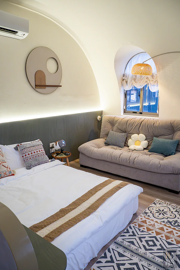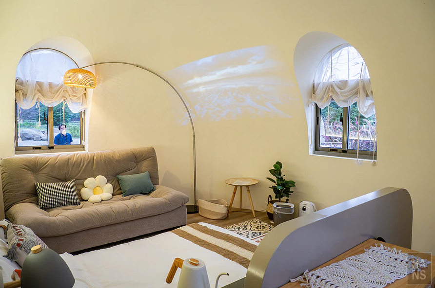 《波希謐境》的住宿空間是外型非常可愛的「波波屋」,室內設計注重細節,質感高雅。溫馨的燈光、淡雅的色調裝點,營造出平靜放鬆的環境,並提供現代化的設施,以確保住客的舒適度。室內空間約有8.5坪,有兩人與四人房兩種房型,是可放下一至二張足尺吋的雙人床的寬敞空間設計,有充足的移動置物空間,住客可以輕鬆整理行李,沒想到圓圓的可愛波波屋,內部居然有這麼大的魔法空間,設計團隊實在太厲害啦