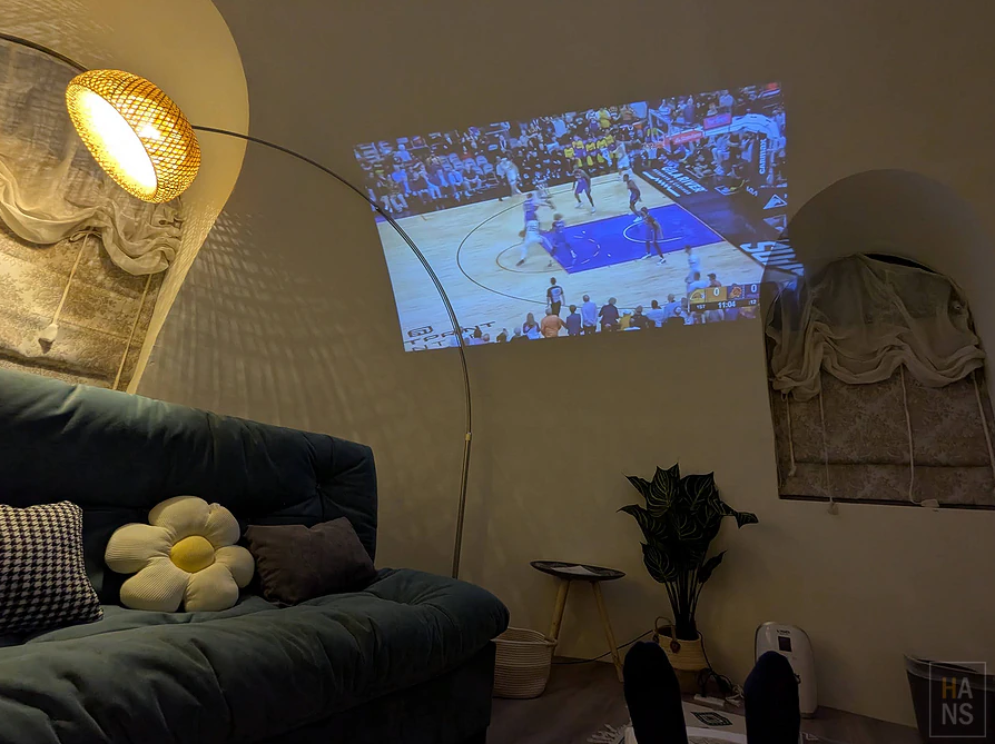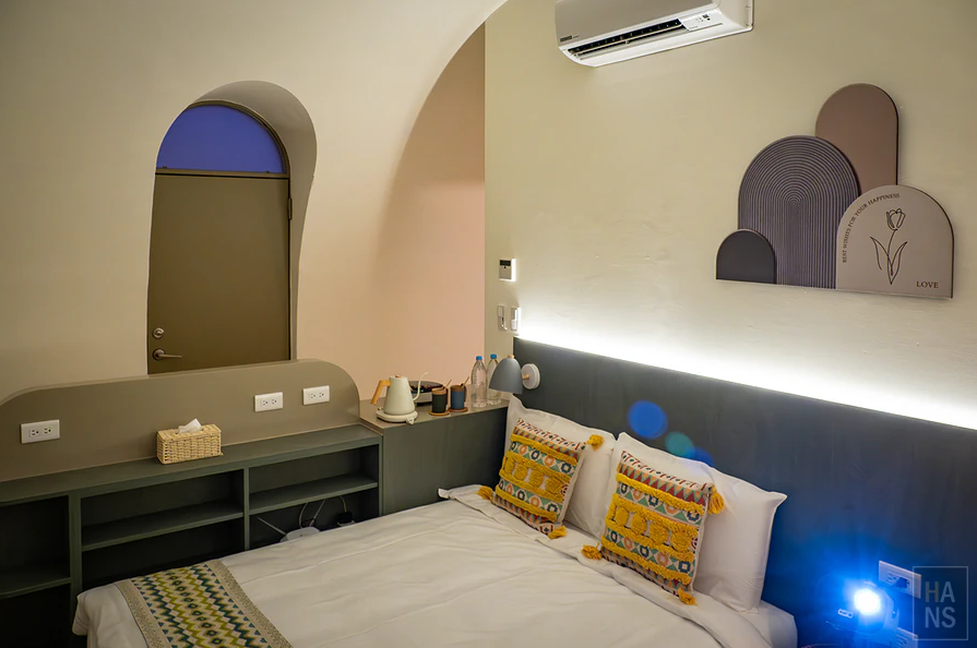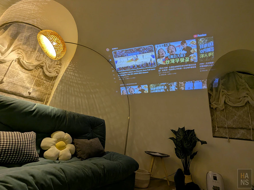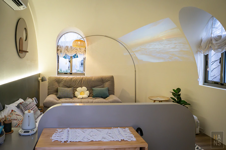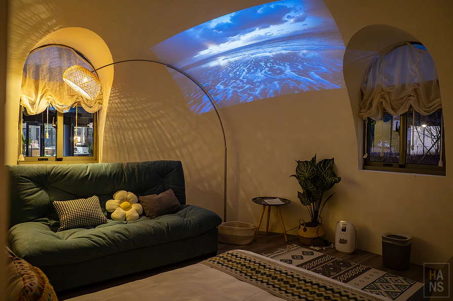 其中我最喜歡的,還有床頭一旁的投影機,可投放超大畫面在波波屋裡的米色牆壁上!投影機內建 Google Android 智慧播放系統,可以直接欣賞 YouTube、Netflix 等等熱門影音 app,就像在家一樣。
