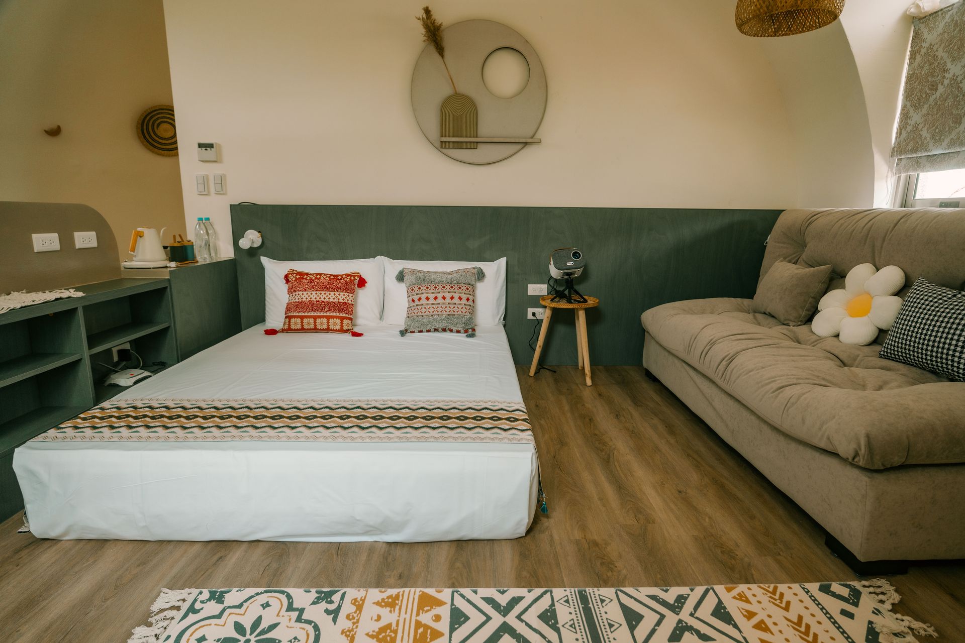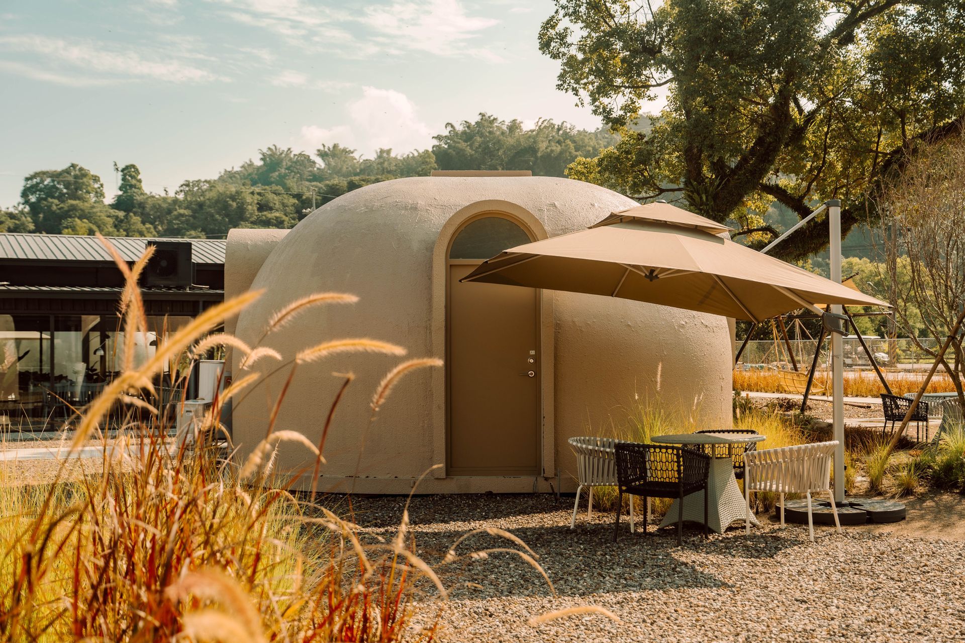 入境途經漫山竹林與綠意環伺的自然山野,宛如沈澱心境放鬆神經的前奏,而依山傍溪的盆地露營區視野開闊,和造型獨特的圓弧波波屋帳篷相映成趣。而強調低碳環保的永續理念亦於營區中處處可見,自建築選用之環保建材、有機植栽以及環保再生之寢具洗沐用品,例如台灣首張獲得碳足跡標章的眠豆腐床墊、可再生纖維製成的羽絨被、零碳排洗沐品等,皆讓空間散發出無過多人工修飾的自然氛圍,讓旅人自喧囂忙碌的生活節奏裡重拾旅行的感動與對自然的渴望。